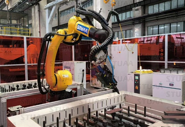 超大功率(12,000瓦)完全實現(xiàn)機器人免示教激光切割坡口設(shè)備。工件圖紙導(dǎo)入到電腦中,工件隨意的放在工作臺上,機器人通過視覺拍照,給工件定位,無需人工編程,可自動生成程序,一鍵啟動,進行切割。本臺設(shè)備配備了雙工位,可以滿足客戶多品種小批量的問題,可以適應(yīng)多種型號工件的打坡口工藝!