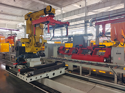 叉車門架生產(chǎn)線集成了通過(guò)式拋丸、機(jī)加工、軸頭自動(dòng)拼點(diǎn)及焊接等工序,可將定尺的槽鋼原材料制造成應(yīng)用于叉車內(nèi)、中、外門架的槽鋼總成。本產(chǎn)線內(nèi)工件在各個(gè)工序均為自動(dòng)化流轉(zhuǎn),且線端和線尾也通過(guò)搬運(yùn)機(jī)器人配合AGV完成原材料和成品的自動(dòng)化轉(zhuǎn)運(yùn),真正實(shí)現(xiàn)了整線的無(wú)人化運(yùn)行,為用戶提高了生產(chǎn)效率、提升了產(chǎn)品質(zhì)量、降低了人力成本,獲得了客戶廣泛的認(rèn)可和好評(píng)。